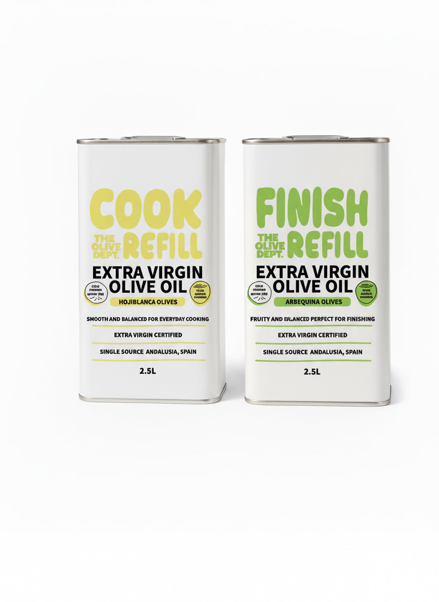 Packaged in our signature easy-squeeze bottles, this duo makes olive oil functional, and refillable. No drips, no fuss - just high-quality oil.